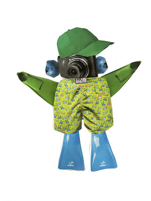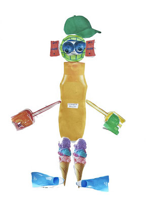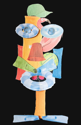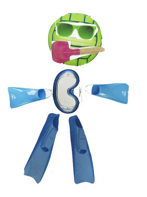 Anschließend malen wir uns unter Wasser. Die Arme weit nach oben gestreckt schweben wir unter der Wasseroberfläche. Mit Deckweiß wird die Hautfarbe gemischt, nach dem Trocknen malen wir Badehose, Badeanzug oder Bikini. Auch Augen, Nase und Mund werden möglichst zum Schluss aufgemalt, sonst verschmiert alles.