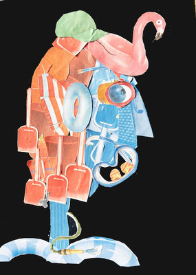 Bildgröße wahlweise A3 oder A4, Deckfarben, Deckweiß, Hintergrund: Tapetenrest mit Acrylfarben gemalt und gerissen, Transparentpapier