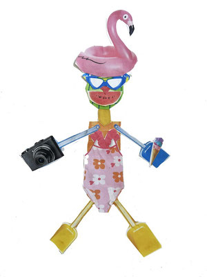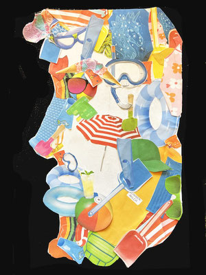 Zu Beginn der Stunde bin ich mit den Schülern auf den Schulhof gegangen. Dort haben sich einige Schüler auf den Boden gelegt und die anderen durften mit Kreide eine genaue Umrisslinie um ihre Körper ziehen.Wir betrachteten die Umrisslinien. Was gehört alles zum Körper: der Kopf, der Hals!!!, die Schultern, der Rumpf, Arme und Beine, aber auch die Hände und Füße darf man nicht vergessen. Im Klassenzimmer haben wir noch die individuellen Merkmale besprochen. Was macht mich "besonders"? Haarfarbe, Haarlänge,Frisur, Augenfarbe, Hautfarbe. Mit dem Spiegel durften sich die Schüler genau betrachten, dann wurde die liegende Figur möglichst formatfüllend mit Deckfarben (Das Mischen der Hautfarbe haben wir vorher ausprobiert) auf das Papier gemalt. Auf eine Vorzeichnung habe ich bewusst verzichtet, da sich die Schüler erfahrungsgemäß viel zu klein zeichnen. Da die Figur später ausgeschnitten wird, kann sie jederzeit korrigiert und verändert oder später in Form geschnitten werden! Die Badehose oder der Badeanzug wird über die getrocknete Hautfarbe gemalt, auch das Gesicht! Das Strandlaken darf beliebig gestaltet werden. Wer mit allem fertig ist, kann noch Sonnenschirme gestalten oder den Schriftzug: SCHÖNE FERIEN!