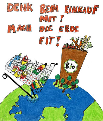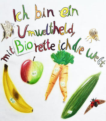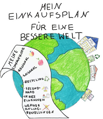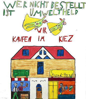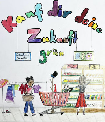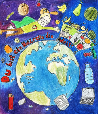 "Ich bin Umweltheld*in- das ist unser Einkauf von morgen!" Ein Plakat, welches die deine Zukunftsvisionen und Meinungen oder Sorgen zu unseren Einkaufsgewohnheiten ausdrückt und eine Botschaft an deine Mitmenschen sendet.